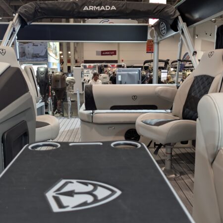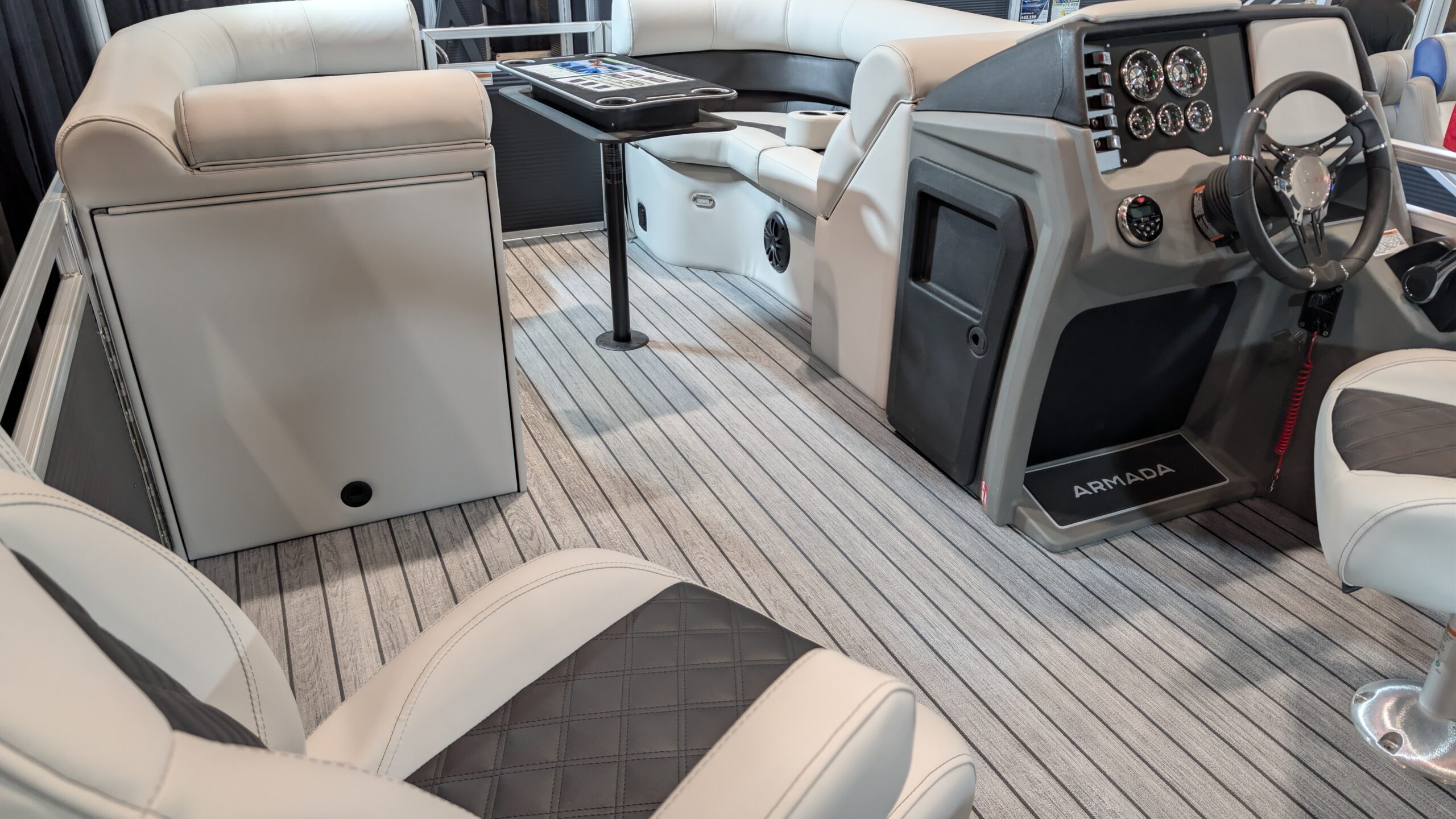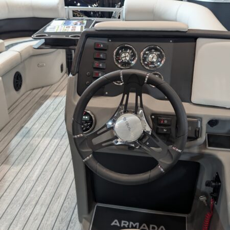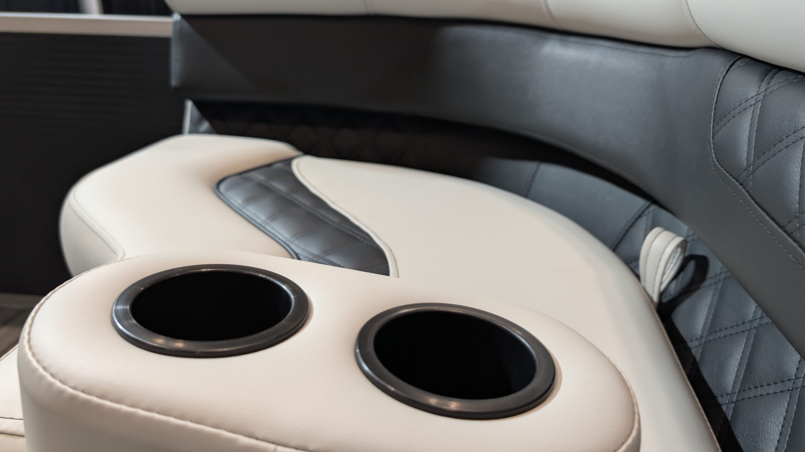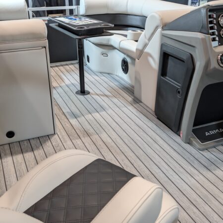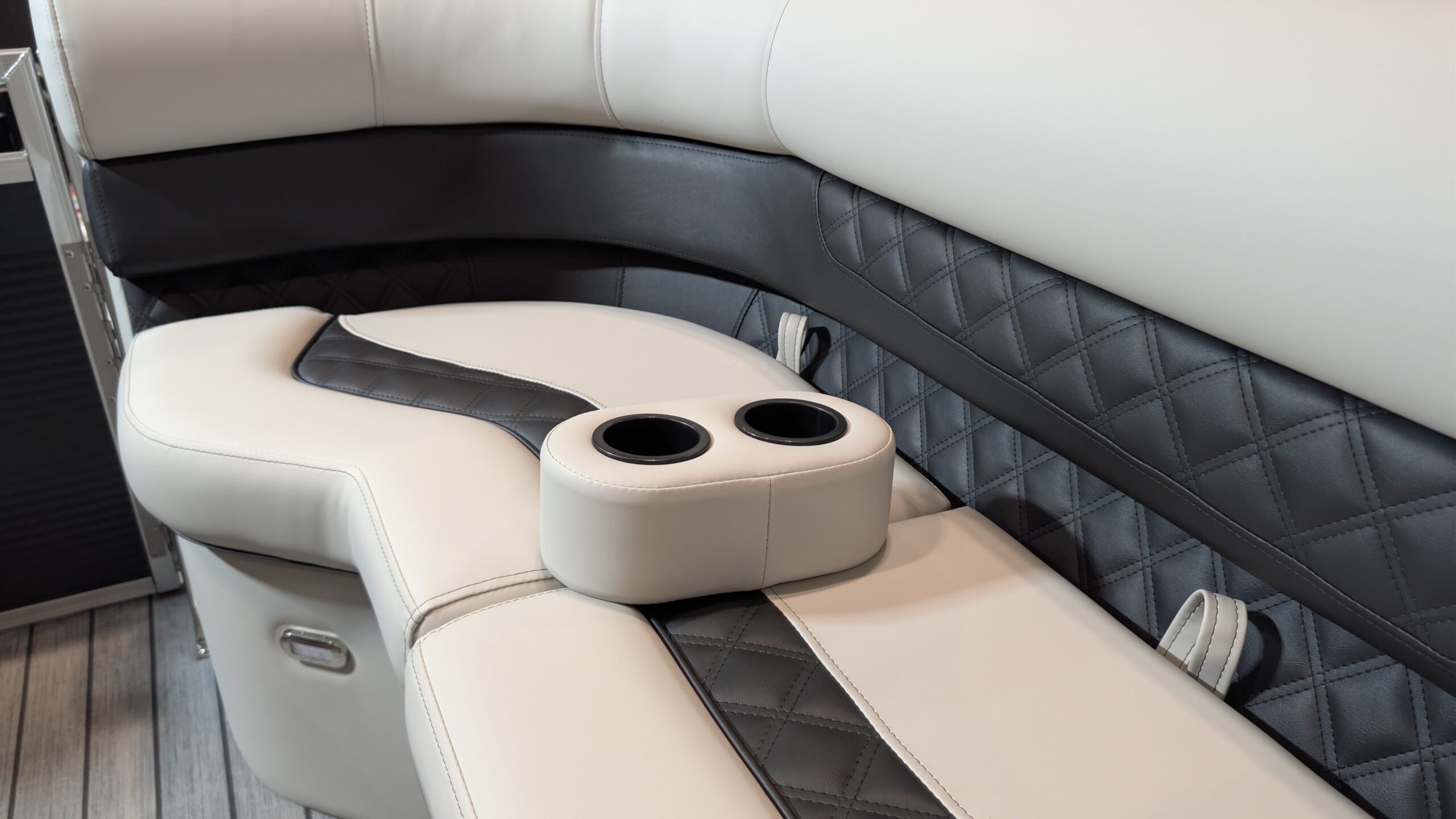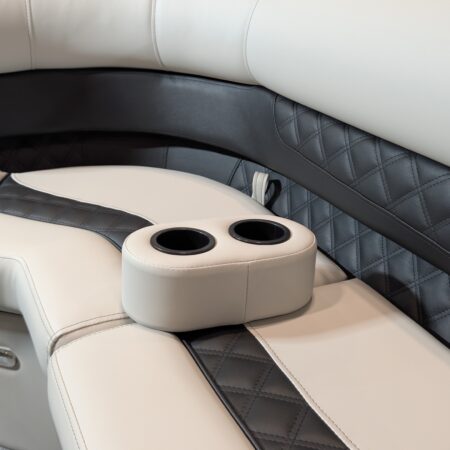 - Large rear bench with “Swing back” backrest that tilts to face forward or backward on the pontoon