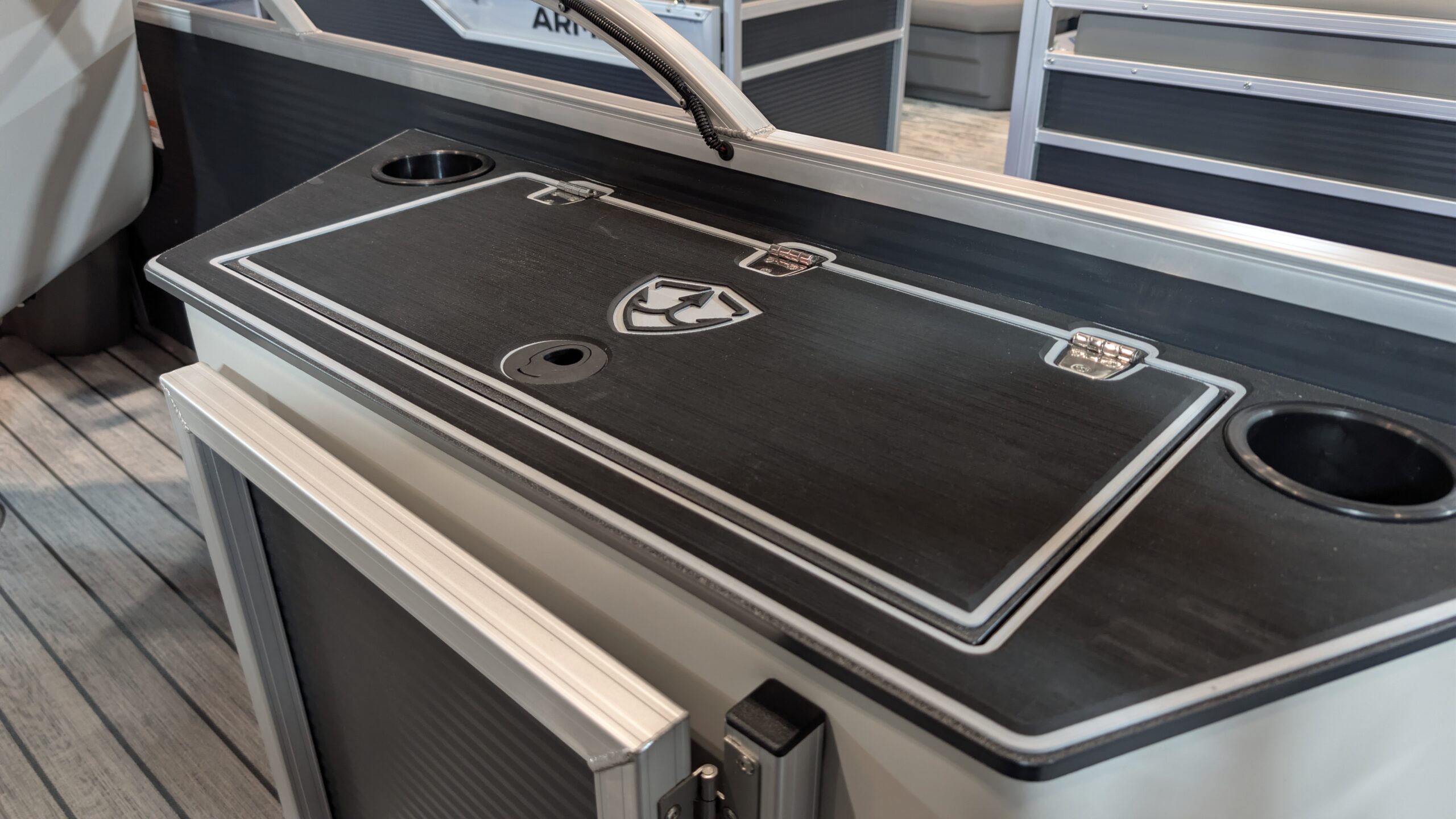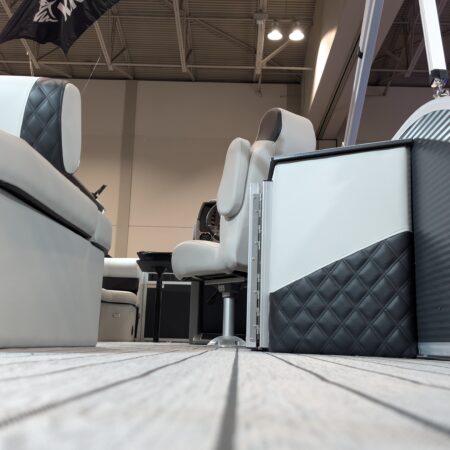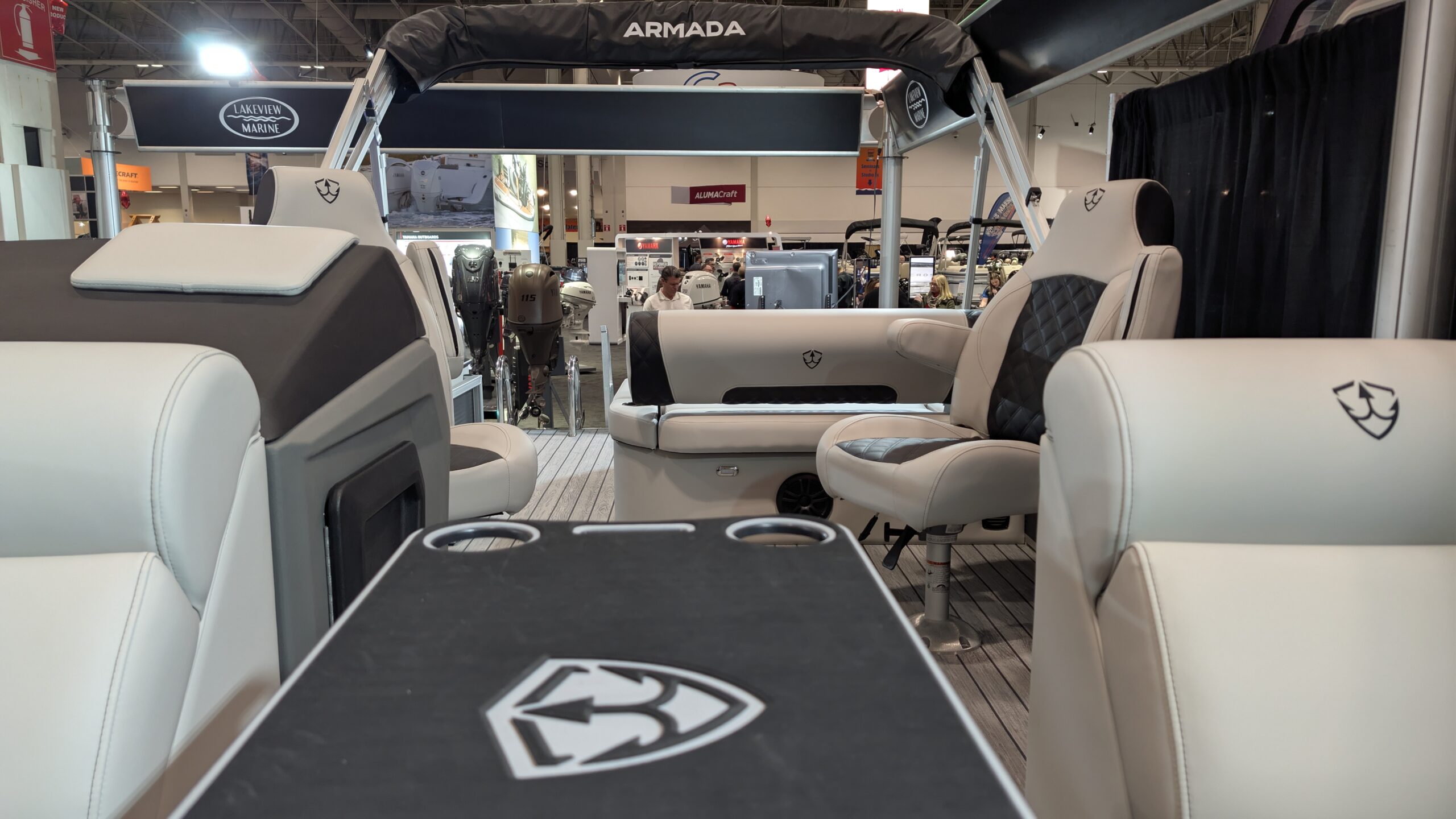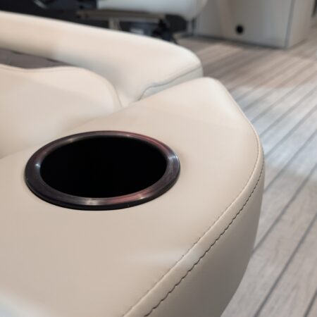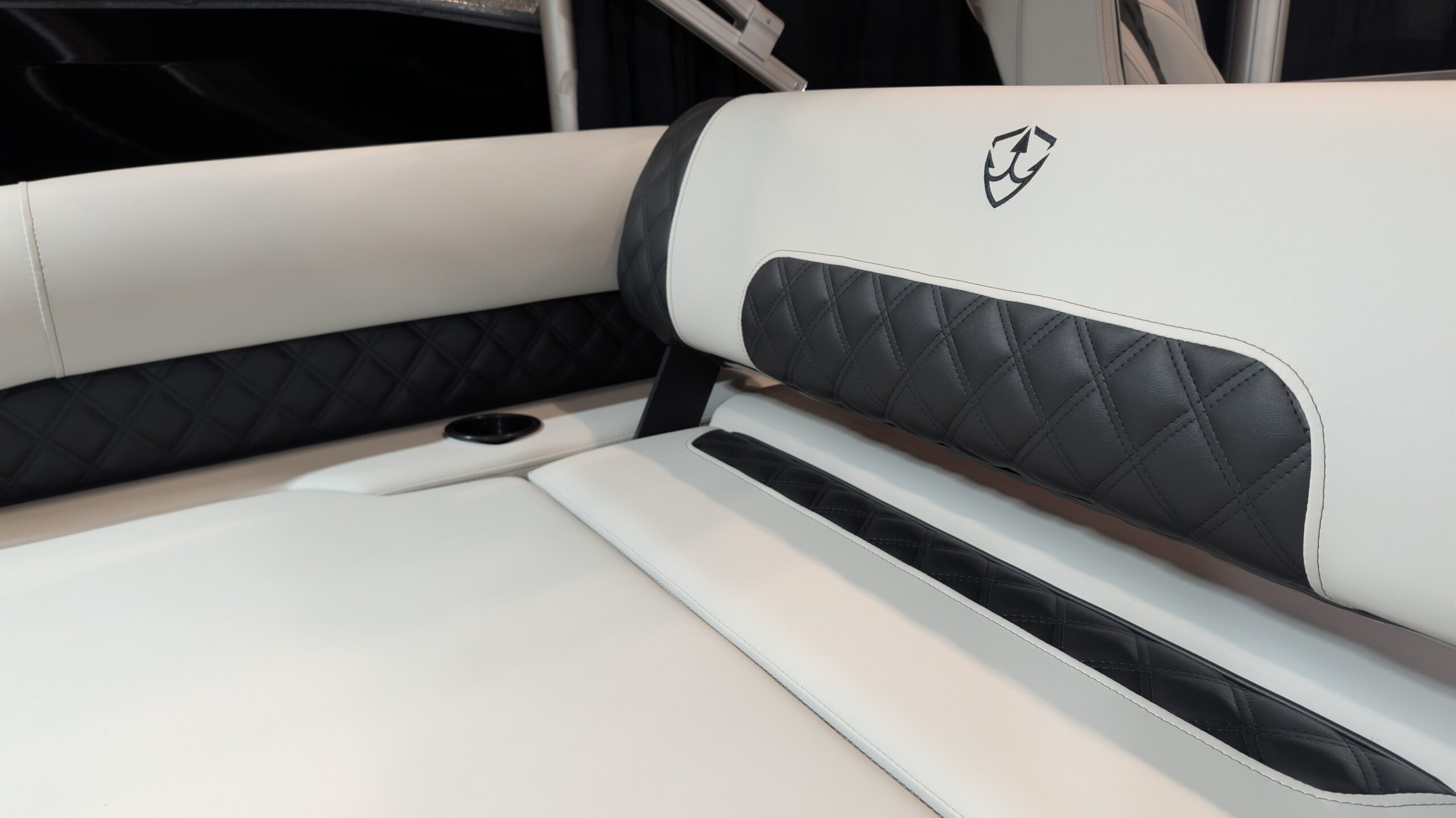 - Large rear bench with “Swing back” backrest that tilts to face forward or backward on the pontoon