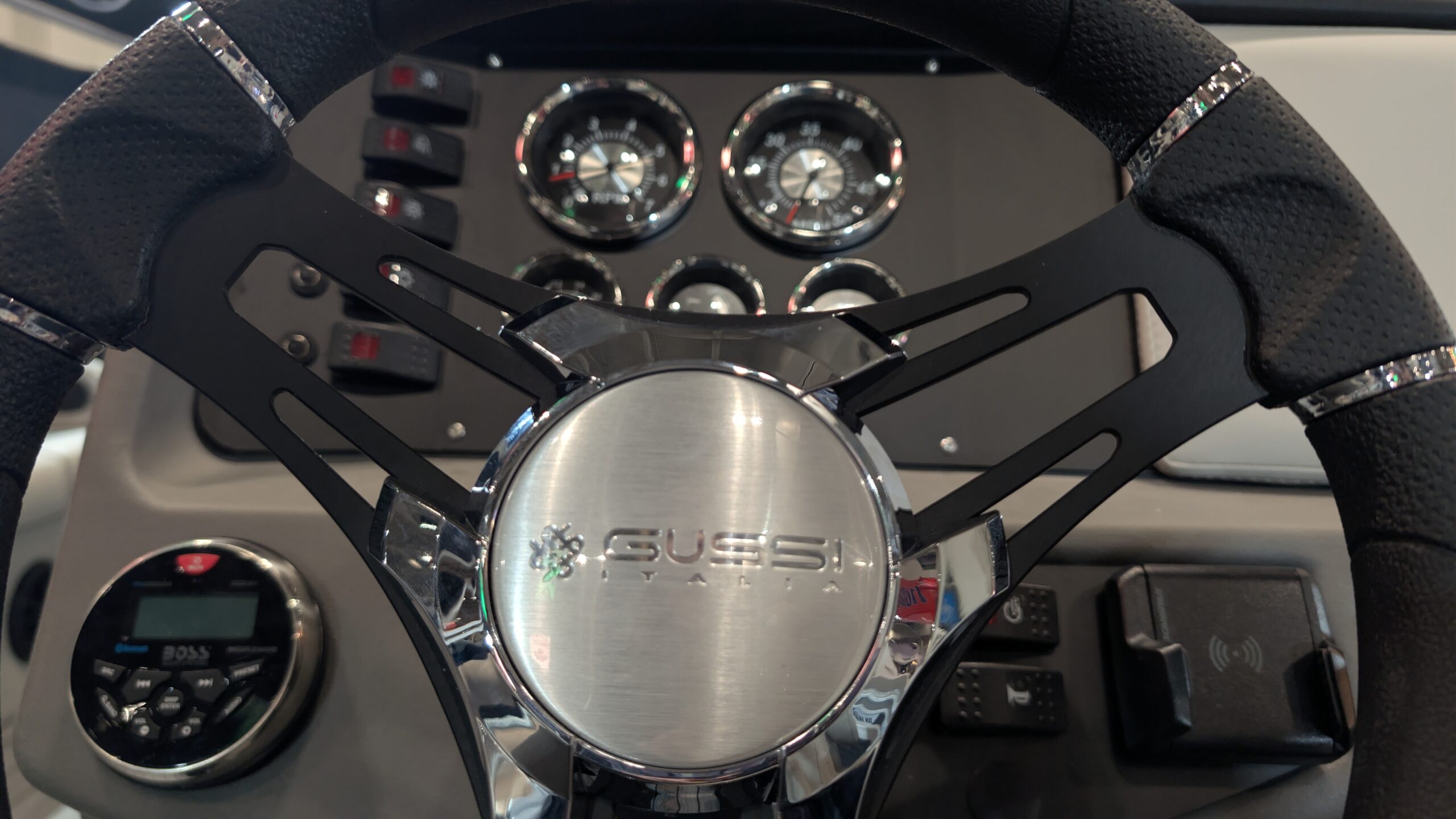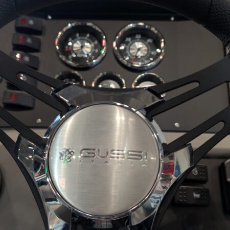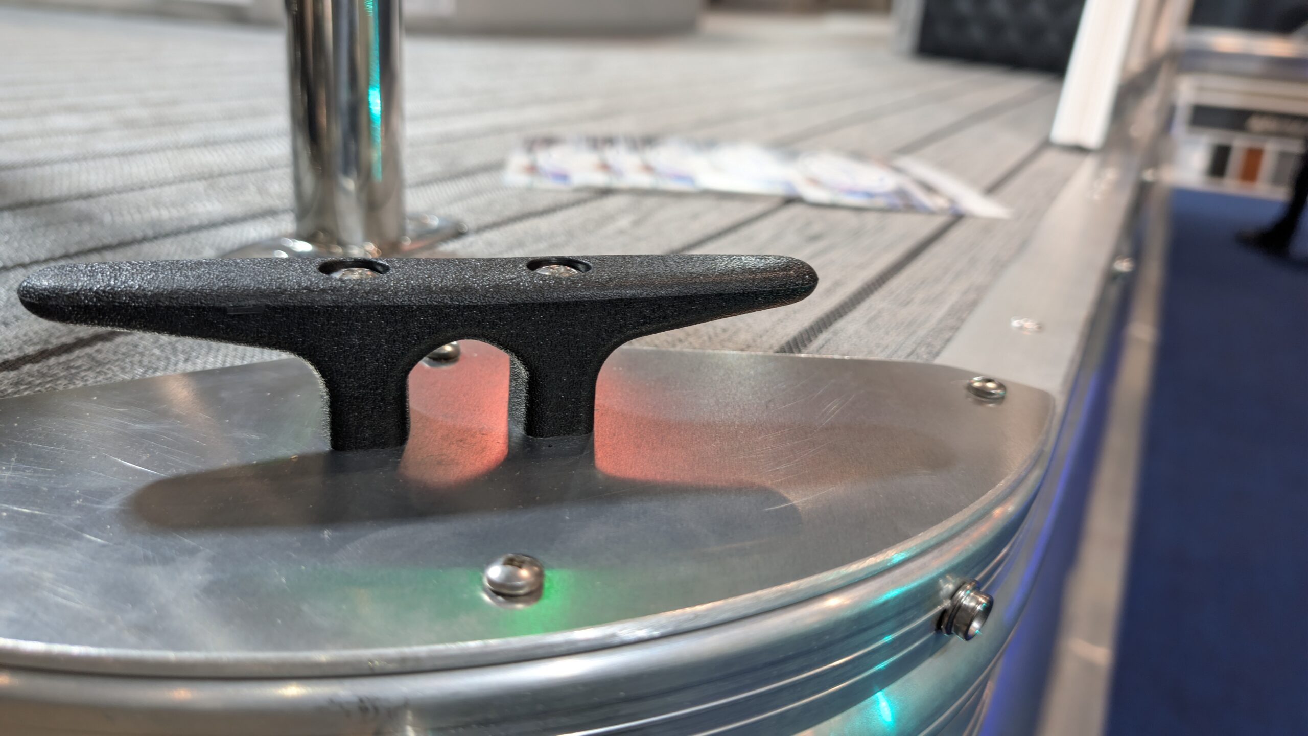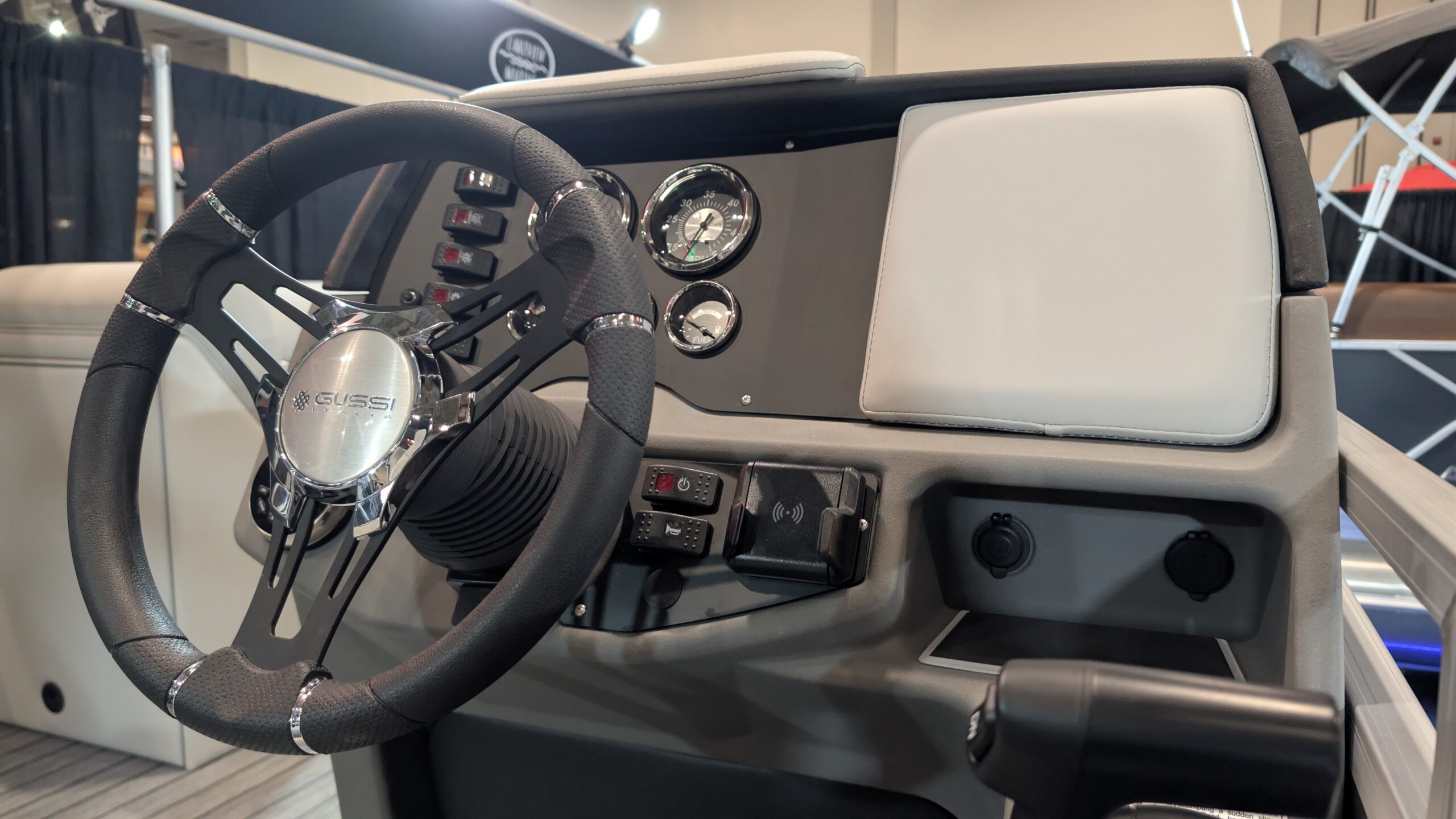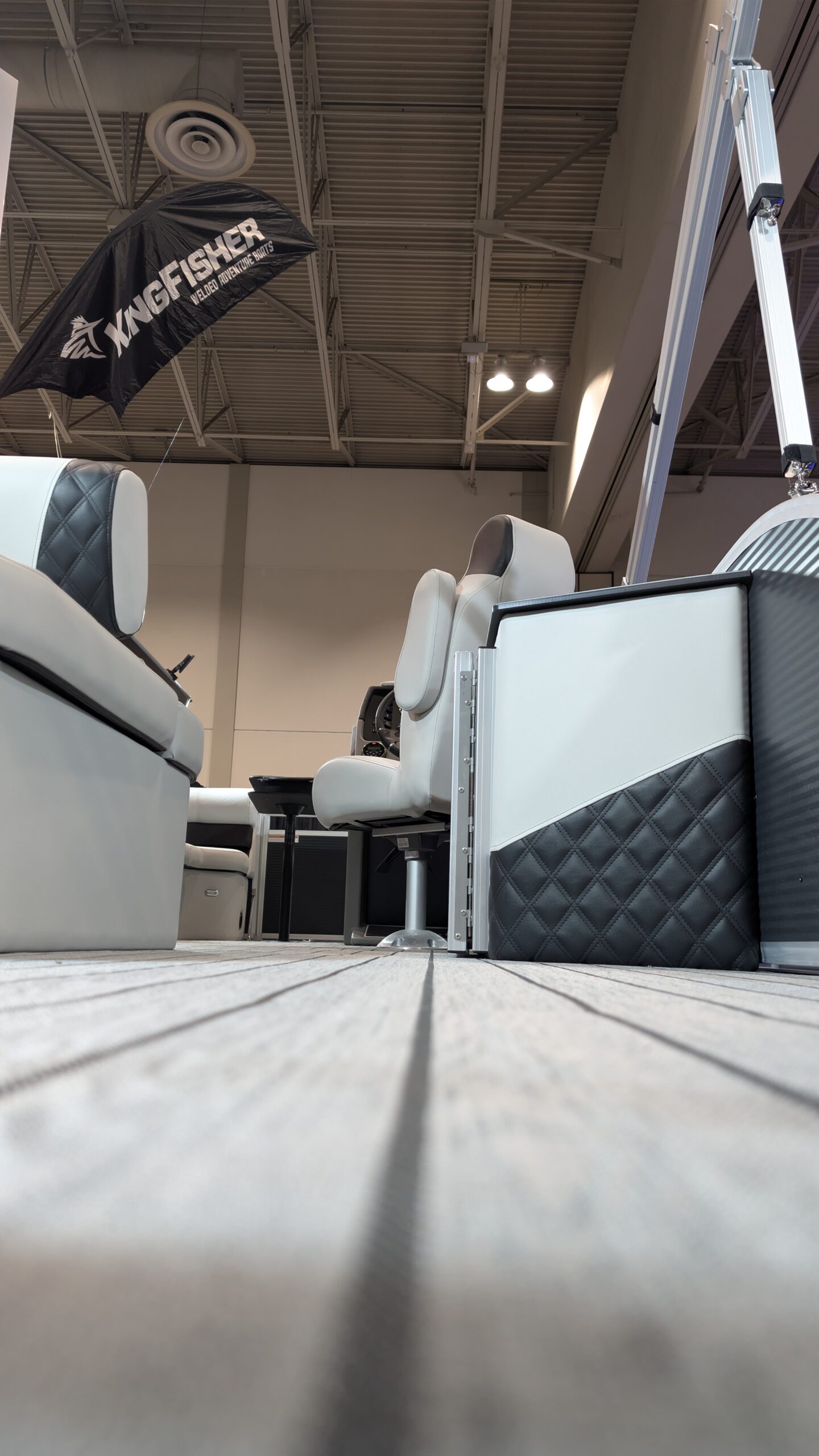 - Large rear bench with “Swing back” backrest that tilts to face forward or backward on the pontoon